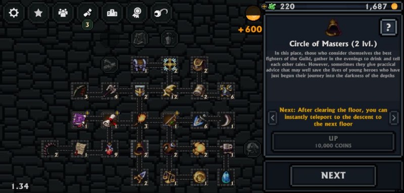 The next upgrade of the Circle of Masters can wait (it teleports you immediately to the exit of the level after you clear the floor), but let’s go for more important nodes.