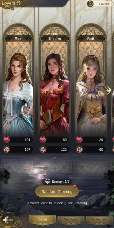 恋人には、上げる必要がある2つの主要な統計があります。親密さはハートで示され、魅力はバラで示されます。これらの両方のステータスを上げることは重要ですが、どのパートナーを持っているか、どの騎士に多額の投資をしたかによって、他のものよりも重要になるものがあります.恋人たちを定期的に訪問するということは、通常、ランダムな挨拶の試行を消費することを意味します。これは最大 3 回ですが、30 分ごとに 1 回補充されます。ランダムな挨拶は恋人のパワー ポイントを増加させる可能性がありますが、これは恋人の親密さと魅力のレベルには影響しません。