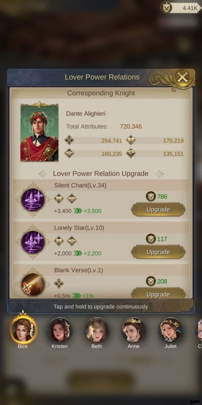 ゴールドを使って恋人をデートに誘ったり、ギフトを贈って親密さのレベルを上げることができます。親密さの特定のマイルストーンに到達すると、彼らが生み出す相続人の属性が増加します。さらに重要なことは、親密さのレベルが高いほど、恋人たちはより多くのラブ パワー リレーションシップを獲得できるようになり、対応するナイトのアップグレード オプションがさらにアンロックされます。デートはまた、相続人を生み出すことを保証します.ランダムな挨拶もデートにつながる可能性があり、すぐに子孫を確実にします。