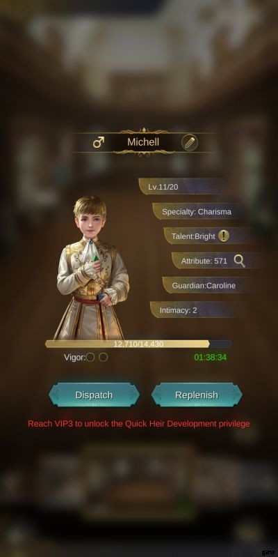 相続人は時間の経過とともに経験値を獲得し、新しいレベルに無駄に到達しますが、利用可能なガイドの試行をそれらに費やすようにしてください.レベルを上げたい場合は、2回のガイド試行を即座に補充することもできます.相続人が最大レベル (基本的には 20) に達すると、家を出て結婚する準備が整います。ただし、恋人同士の親密さのレベルは、相続人の才能とレベルの上限にも影響を与える可能性があり、後でより多くの国家権力を獲得できるようになります。