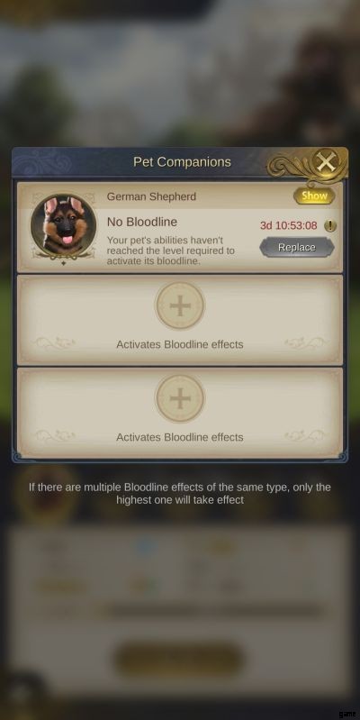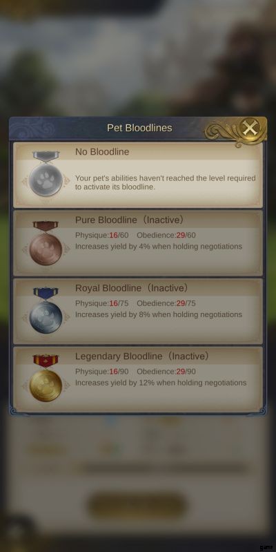 ペットの血統は基本的に受動的なブーストであり、King's Choice の特定の機能にプラスの影響を与えることができます。血統を活性化してその効果を改善するには、ペットの能力要件を満たす必要があります。ジャーマンシェパードを例にとると、体格と服従のステータスが60に達すると、純粋な血統がアクティブになります。これにより、交渉からの収量が4%増加します。 Physique と Obedience の両方が 75 と 90 に達すると、付与されるブーストがそれぞれ 8% と 12% に増加します。