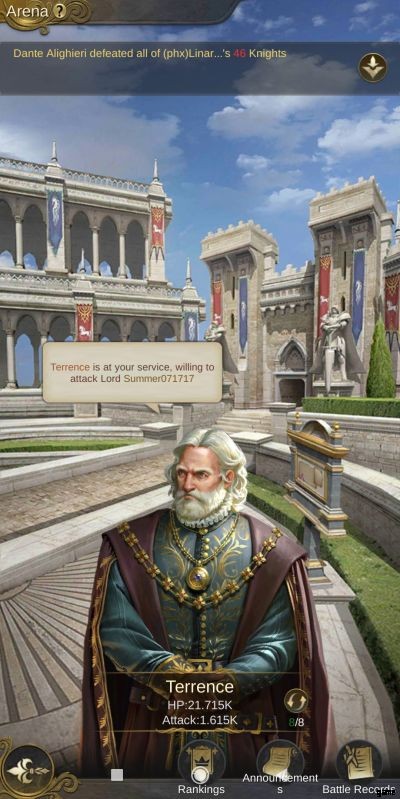 The Arena in King’s Choice is unique and most experienced players, as far as variety of games played are concerned, will find it incomparable to more conventional arena combat. Arena battles involve all the knights in your employ, subject to some conditions. Only knights who are at least at level 60 can join arena challenges but when you are challenged by other lords, all knights in your employ will be considered.