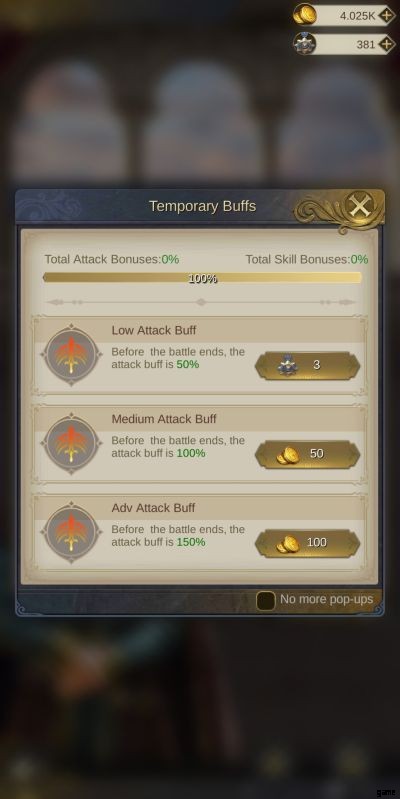 After defeating an opponent’s knight, Honor Medals you earn can also be consumed to purchase temporary buffs. These buffs can vary in efficacy based on their relative costs. Buffs can increase attack power or even replenish a certain percentage of lost health. As a basic strategy, it becomes important to choose the best fitting buff after each round.