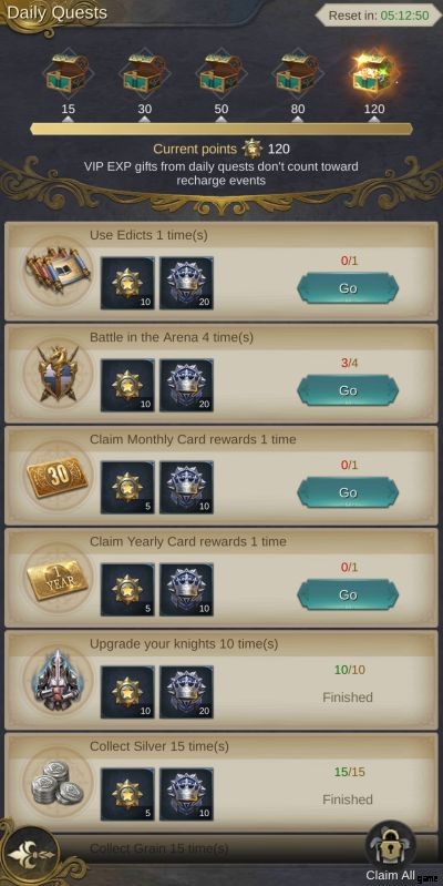 Although it is apparently optional, holding banquets is something we consider as part of our daily routine in King’s Choice. Holding banquets cost gold as well as other resources for bigger ones. Earning banquet points are important as these can be exchanged for different valuable items at the banquet store. Although you can attend banquets consuming only silver for more points, do consider spending gold sometimes, especially for banquets of fellow alliance members.