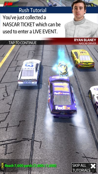 NASCAR Rush をプレイする際に最も集中するのはミッションですが、エンドレス レース モードに参加することもできます。可能な限り。しかし、ミッション モードとの違いはそれだけではありません。燃料がなくなったり、タイヤが完全に摩耗したり、車に最大のダメージを与えたりすると、レースは終了し、次のチャンスは与えられません。走り続けるために!主な報酬は現金ですが、燃料、カード ゲームのトークン、特別なイベントのチケットを獲得することもできます — たまに、カードやカード ピースを手に入れることさえあります!