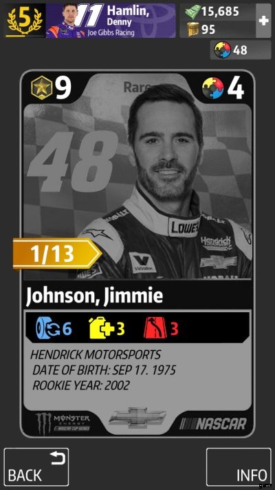 集めたカードによって車が良くなります。たとえば、ジミー・ジョンソンのドライバー カードを見てみましょう。これを集めると、車線変更速度が 3 レベル、タイヤ交換速度が 6 レベル、燃料タンク容量が 3 レベル追加されます。ただし、完全にロックを解除するには、彼のカードの 13 ピースが必要です — ドライバーがレアであるほど、またはティアが高いほど、ロックを解除するために必要なピースが多くなります。また、パックを購入したりカードを獲得したりすると、完全なカードではなく、ほんの一部を取得します。また、ジミー・ジョンソン カードを完全にアンロックすると、4 つのフラグメントを獲得できます。フラグメントは、自分のアバター カードのステータスをアップグレードするために使用されます。すでに完全にロックを解除したカードの完全なカードを取得した場合でも、複製と引き換えにフラグメントを取得できます。