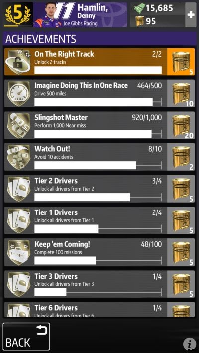これも少し隠されていますが、画面の右側の上部近くにあるトロフィー アイコンをクリックすると、実績にアクセスできるようになります。トラック、特定のマイル数の運転、特定のティアのすべてのドライバーのロック解除など。各アチーブメントを完了すると、特にゴールドを獲得できます。それほど多くはありませんが、NASCAR Rush でより多くのアチーブメントを完了すると、時間の経過とともに確実に加算されます。