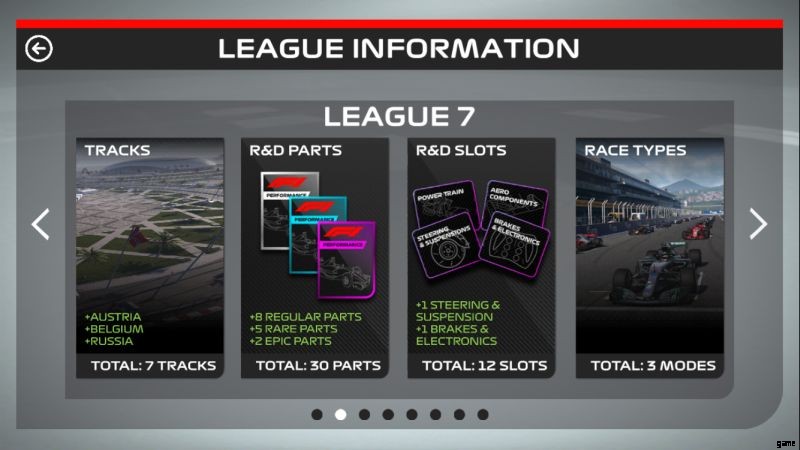 リーグ 8 で 400 ポイントを獲得すると、リーグ 7 に昇格し、3 つの新しいトラック (オーストリア、ベルギー、ロシア)、15 の新しいパーツ、および 2 つの新しい R&D スロットを、既に持っているものに加えてアンロックします。ここでアイデアが得られます — 勝利数が多いほどポイントが多くなり、ポイントが多いほどより良いリーグに昇格し、より良いリーグはより多くのものがアンロックされ、車を改善する機会が増えることを意味します.