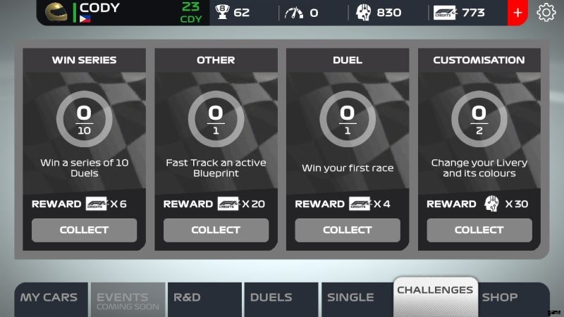 さらに資源ポイントまたはクレジットが必要ですか?幸いなことに、F1 Mobile Racing には、特定のタスクを完了するための無料のリソース ポイントまたはクレジットを獲得できる、またはゲームでそれらをチャレンジと呼ぶクエスト システムがあります。たとえば、上記で説明したように、一連の 10 回のデュエルに勝つと 6 クレジット、または特定のカスタマイズ タスクを実行すると 30 リソース ポイントを取得できます。これらのタスクは、モバイルゲームでよくあることですが、より高いリーグに上がろうとするときに正しい軌道に乗ることができ、自然にゲームをプレイすることで完了することができます.それでも、これらのチャレンジを完了する前に、これらのチャレンジを実際に確認することをお勧めします。そうすれば、何をする必要があるかがわかります。たとえば、対戦相手の車に触れることなくグリッド スタート レースに勝たなければならない課題があります。これには、通常よりもさらに注意を払い、完璧を期す必要があります!