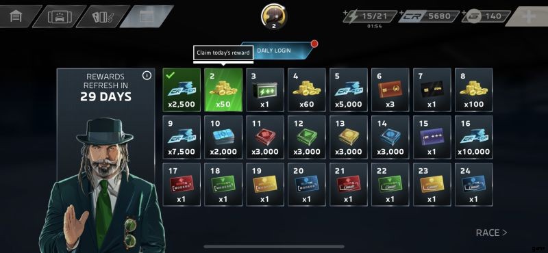 まず、[毎日のログイン] タブでは、1 日目に 2,500 クレジット、2 日目に 50 ゴールドから始まる毎日のログイン報酬を引き換えることができ、チャレンジ カードや 4 種類の特定のカードなど、他の種類の景品にまで拡張されます。ゲーム内の車のクラス。実際のレースに参加する時間がない場合でも、数秒から数分ログインするだけで十分です。これで、デイリーを引き換えることができます!