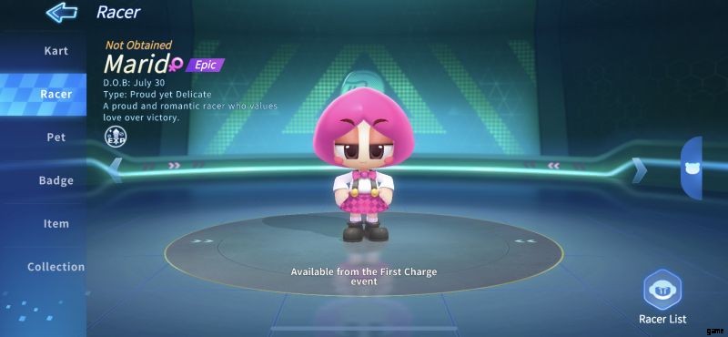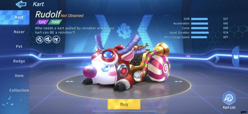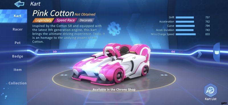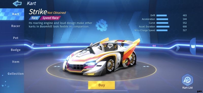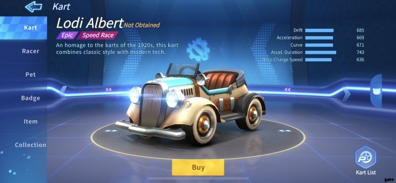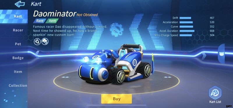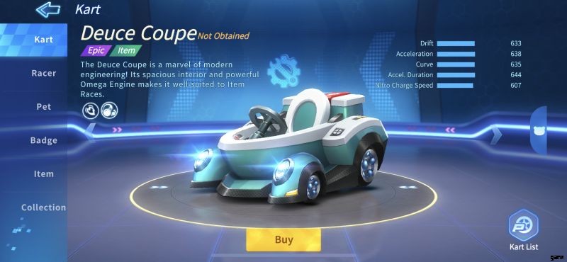 デザイン的には、ゲームで使用するかなり派手なカートです。ただし、これは初心者向けの乗り物でもあり、カートを 1 つか 2 つ購入するために K-Coin を貯めていると仮定すると、K-Coin で簡単に購入できる乗り物と見なすこともできます。加速持続時間は強みであり、カーブと加速の統計も初心者および中級者のレーサーにとって十分にまともですが、ドリフトの統計は少し望まれます.