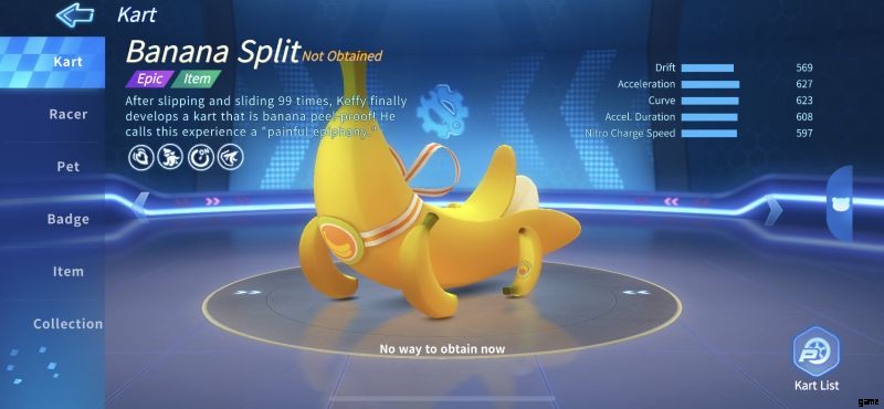 バナナの形をしたタイヤにバナナの形をしたカートで、ご想像のとおり、これは従来のバナナの皮をジャイアント バージョンに置き換えることができ、敵のバナナの皮を 100% の確率でブロックできるアイテム レース カートです。 .アイテム レースに推奨されるすべてのエピック カートの中で統計的にはおそらく最も印象的ではありませんが、一時的な報酬として獲得した場合は、バナナ中心の特別なスキルを試してみる価値があります.