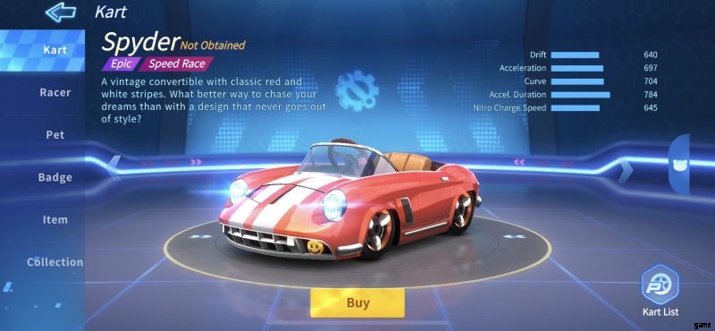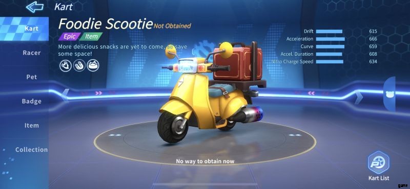 ドリフトとニトロの充電に関してはあまり良いカートではありませんが、784 の印象的なベース加速持続時間を持つ複数のエピック カートの 1 つであり、デザインを優先するカートライダー ラッシュ + プレーヤーにとって理想的です。実車そっくりのカート。ストレートでの優れたパフォーマンスとクラシックで時代を超越したデザインの組み合わせにより、多くのプレーヤーに非常に人気があります。