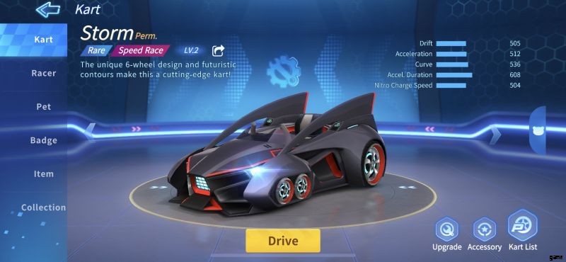 ストームは、6 輪のデザインと「未来的な」外観を備えた、ゲーム内で最も美しいカートの 1 つと考えられていますが、実際には低層の車両の 1 つです。より冒険的で、長いストレートでより良いパフォーマンスを発揮するものを探している初心者レーサーにおすすめです。以前は、Nova プログラム チャレンジで永続的なカートとして利用できたので、このカートを永続的なリストに入れている場合は、練習用カートよりも少しアップグレードされています。