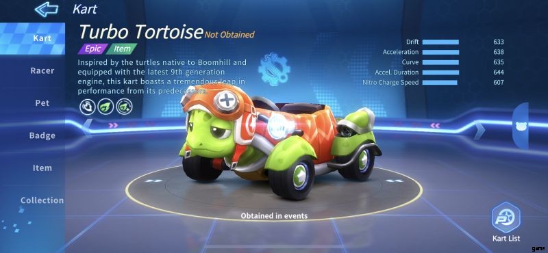 興味深いことに、このカートの統計はターボ トータスとまったく同じですが、これは明らかに伝統的なデザインの乗り物であり、広々としたインテリアと「強力な」オメガ エンジンを備えたカートです。これはアイテム レースに適しています。Turbo Tortoise に興味はあるが、入手が限られているために落胆する可能性がある場合は、一時的な報酬として獲得するか、K を貯めたら、これをテストすることをお勧めします。 - 余裕ができたらコインを購入してください。