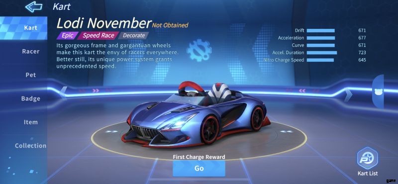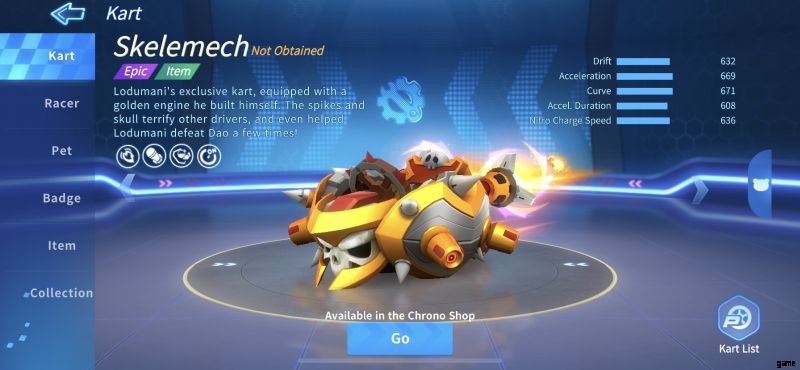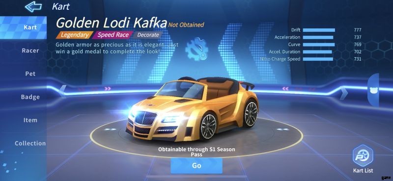 このカートを一時的または永続的に入手するには、グローリー パスを 5 ドルまたはそれに相当する現地通貨で購入し、大幅にレベルアップする必要があります。黄金のロディ カフカがあなたのコレクションに永久に追加されました!このカートは金色の鎧のデザインが際立っており、統計の点では、最適なドリフト パフォーマンスを実現する最高の車両です。