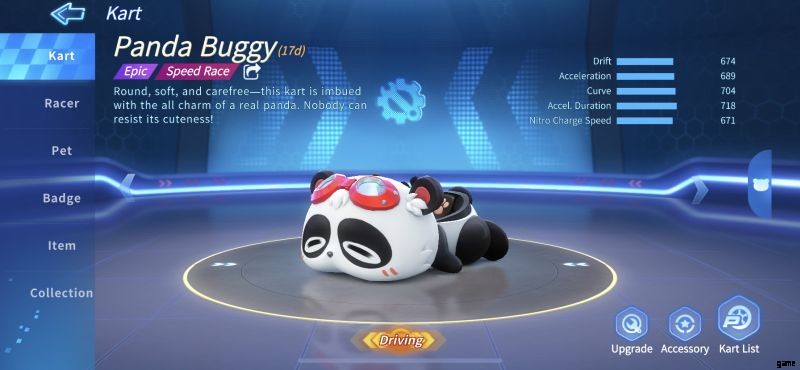 このゲームは、パンダバギーを「本物のパンダのすべての魅力が染み込んだ」乗り物であり、かわいくてたまらないカートだと説明しています。これには同意しますが、このカートが平均的なパンダと同じくらい遅くて簡単だと思っているなら、それは間違いです.これは、長いストレートのあるトラックで使用するのに適したカートですが、しっかりしたカーブ統計から推測できるように、ハンドリングも非常に優れています.
