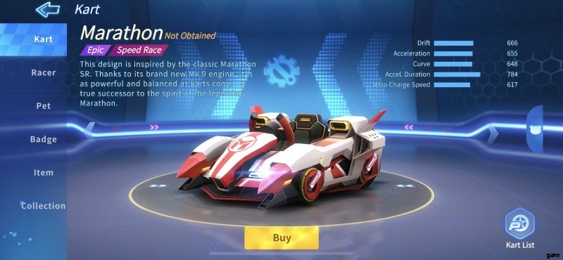 おそらく、これは KartRider Rush+ が説明しているように、「パワフルでバランスの取れたカート」です。 Solid と同様に、Marathon は印象的な 784 の加速持続時間を備えています。これだけでは、これに反することは明らかです。これは明らかに、最も明白な利点を最大限に活用できる長いストレートを備えたスピード レースで運転したいカートです。力。これは、多くのプレイヤーにとって象徴的で人気のあるカートであり、早い段階で数日間テストできる数あるカートの 1 つです。