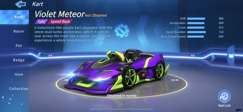 ゲームで説明されているように、Violet Meteor はデュアル ターボ アクセラレータによって際立っています。簡単に言えば、これは非常に印象的でバランスの取れたエピック カートであることを意味します。ただし、現時点では、特別なイベントでのみ利用できます。具体的には、レベル 25 に到達するための永続的な報酬としてのみ利用できます。この悪い男の子をコレクションに追加したい場合は、さまざまなゲーム モードで競うことを忘れないでください!