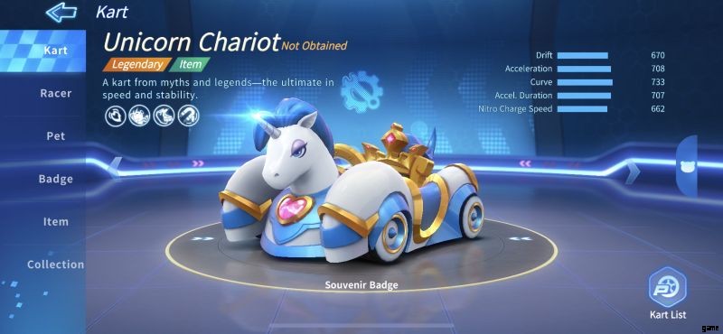 ゲームはそれを「スピードと安定性において究極」と表現するかもしれませんが、これはアイテムレースに推奨されるすべてのカートの中で相対的なものであることに注意する必要があります.これは、カーブを巧みにナビゲートできるカートが必要な場合に、これらのレースで運転したいカートですが、加速関連の統計でも非常に強力で、いくつかのバフ (例:鉱山とバナナの皮からの 100% 保護) があります。さらに付加価値をつけます。ただし、Unicorn Chariot を運転しているプレイヤーはそれほど多くありません。これは、お土産バッジ (特に Quick L-Decoder から Quick L-Badge を取得すること) でのみ交換できるためです。