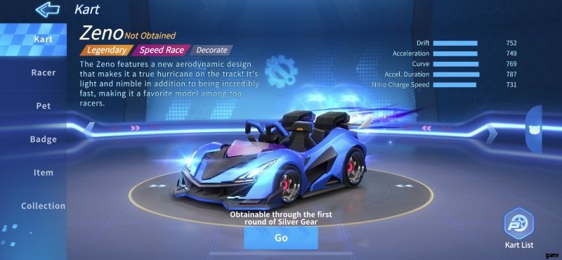 シンプルでエアロダイナミクスに優れたデザインのゼノは、レジェンダリー ティアのオールラウンダーです。このように、これは非常にレアなカートの中で最も安全に運転でき、レアリティ ティアではすべての取引のジャックですが、エピック カートよりもはるかに優れています。ただし、この車両はシルバー ギアの最初のラウンドで入手する必要があるため、通常の通貨で購入できないカートとしては比較的手が届きません。