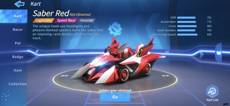 Even more impressive than the Pink Cotton, the hawk-inspired Saber Red is also a speed demon in Speed Races, with slightly more impressive Nitro Charge Speed and Curve performance and similarly strong stats elsewhere. But you’ll need to have enough Golden Gear available to purchase this extremely rare kart, which is, stats-wise, the best overall vehicle among all the available options in KartRider Rush+.