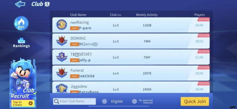 一方、クラブは、ギルドに対する KartRider Rush+ の答えです。 1 つを作成するオプションもありますが、既存の 1 つに参加することをお勧めします。できれば、週ごとのアクティビティ スコアが高いものに参加することをお勧めします。クラブに参加する前に、必ず適格を確認してください。これにより、まだ資格を得ることができない特定の最小プレーヤー レベル要件を持つクラブが除外されるためです。