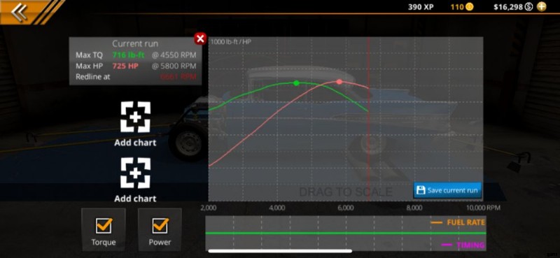 もちろん、Dyno の実行を使用するときも慎重に行う必要があります。理想的には、大幅な変更を行ったとき、または初めて小さな変更を行った後のために、Dyno を保存します。結局のところ、それらは安くはないので、むやみに使用しないでください。このゲームでは、追加の車のチャートを追加し、生成したチャートを保存するオプションも提供されます。後者は、複数の実行にわたって進捗状況を追跡できるため、非常にお勧めです。