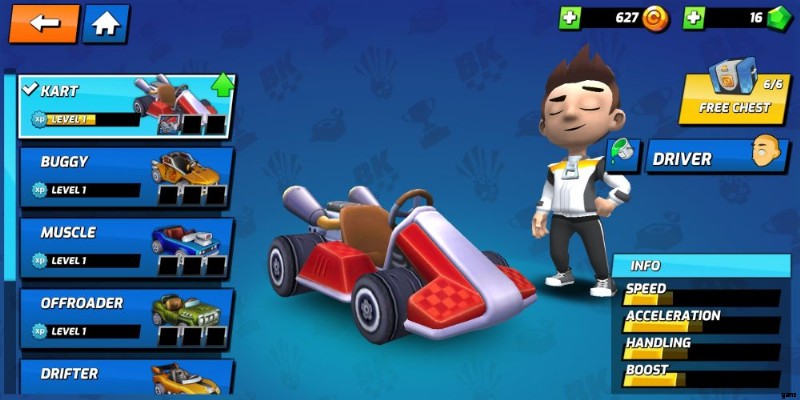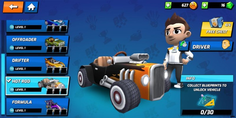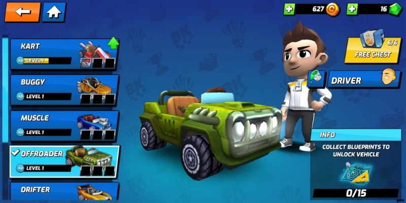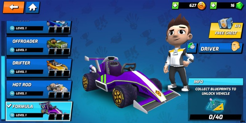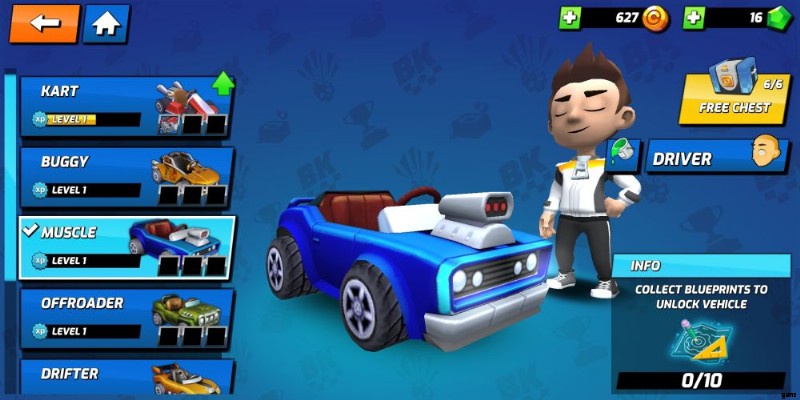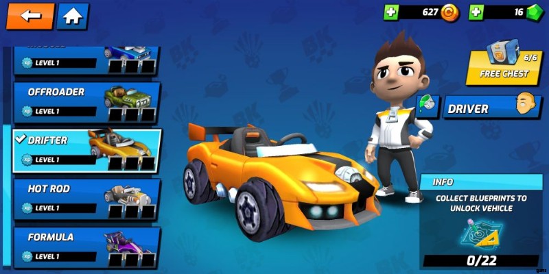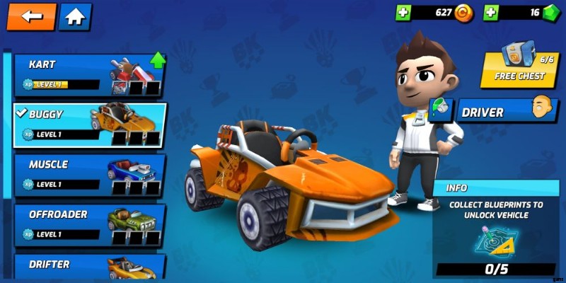 デフォルトのカートを超えて、他の 6 つのカートはすべて、設計図を集めてそれぞれのロックを解除した後にのみロックを解除できます。レースに勝利し、ミッションを完了し、より高いリーグ ランクに到達すると、最初のカートのパーツを収集し始めますが、他のカートのパーツを獲得するには、それらのロックを解除した後でなければなりません。この意味で、最初のカートは、他のカートのロックを解除するまでに強化され、後のカートよりも以前のカートのパーツをアップグレードする機会が増え続ける可能性があります.