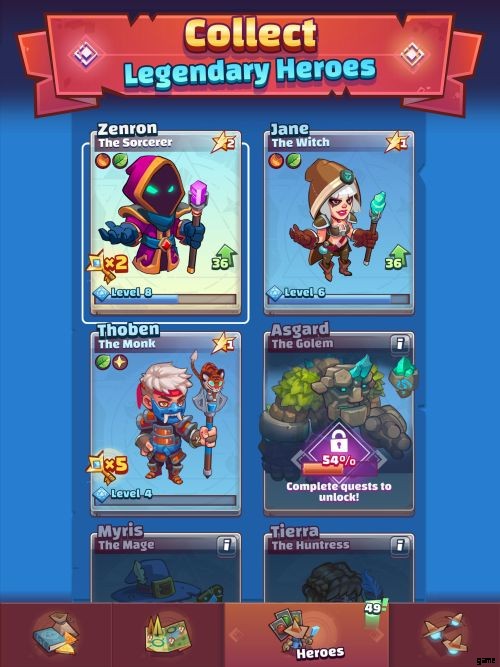ゲームを進めていくと、新しいヒーローと新しい呪文が利用可能になります。マップ上にあるタイム クエストを完了すると、コインやスペル カードを獲得できます。そのため、見つけたら、ためらわずにヒーローを送って完成させてください。クエストが短い場合は、無料ですぐに完了することができます。より長いクエストの場合、2 つのオプションがあります。クエストが完了するまで待つか、宝石を使用して即座に完了することができます。選択はあなた次第です!