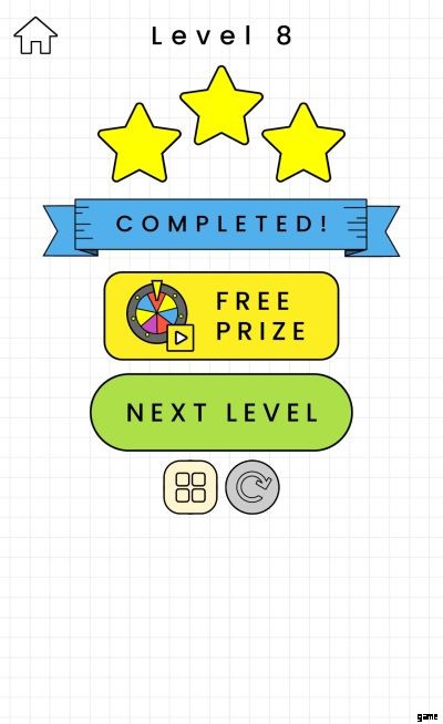 その後、コインのすぐ下に、現在プレイしているレベルを知らせるレベル インジケーターがあります。次に、緑色のバーは、ゲーム終了時に獲得できるスターの数を示しています。前のヒントを思い出してください。最短の線または曲線を描いてレベルを完成させ、より多くの星を獲得しましょう!それでも、星が 2 つしかない場合は、広告ビデオを見て、星 3 つでレベルを完了することを簡単に選択できます。