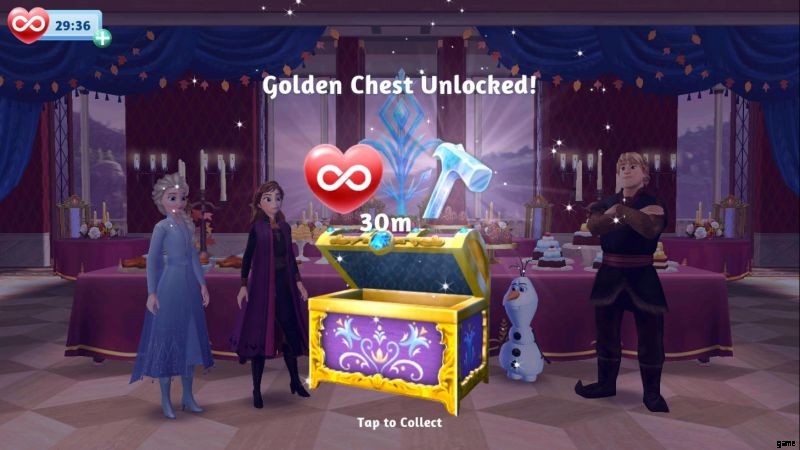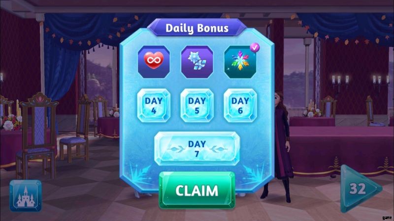 最近の他のモバイル ゲームと同様に、Disney Frozen Adventures は、ログインした日ごとに報酬を提供します。連続してログインすると、より良い報酬が得られ、7 日連続で大きな報酬が待っています。残念ながら、1 日を逃すと、報酬は 1 日目にリセットされます。プレイする時間がなくても、ログインを忘れないようにしてください。これにより、毎日の報酬が進行し続けます。