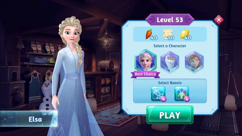 ディズニー フローズン アドベンチャーで力を持っているのはエルサだけではありません。アナとオラフも彼らの力であなたを助けることができます.キャラクターの能力を有効にするには、画面の左下隅にある雪片ゲージを埋めるだけです。水色のタイルを組み合わせるとゲージがいっぱいになります。タイルがいっぱいになると、選択したキャラクターがボードに 2 つの特別なタイルを追加します。