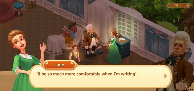 ストーリーラインは、プレイヤーが解決しなければならないマッチ 3 パズルの説得力のある背景を提供するため、間違いなく Storyngton Hall のハイライトの 1 つです。最初に、新しい家に引っ越したばかりのグリーン一家を紹介します。この古い邸宅は、早急に改修が必要です。緑の娘のジェーンが主人公で、彼女は執筆に情熱を注いでいます。いつの日か、彼女は自分のロマンス小説を出版することを夢見ています.