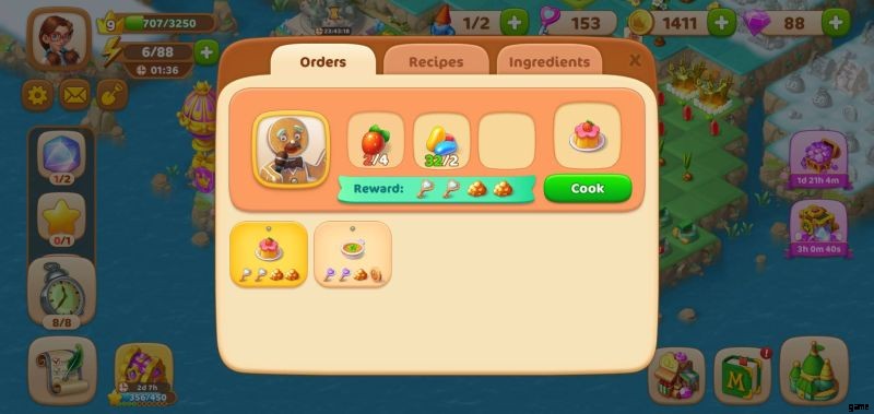 ここでの唯一の問題は、宝石は非常にまれであるため、少し時間がかかるすべてのタスクに宝石を費やすべきではないということです.ジェムは不足しているアイテムの購入にも使用できます。たとえば、レシピを完成させるには追加のイチゴが必要ですか?必要なものを宝石で購入し、余裕があればすぐに注文を完了することもできます。