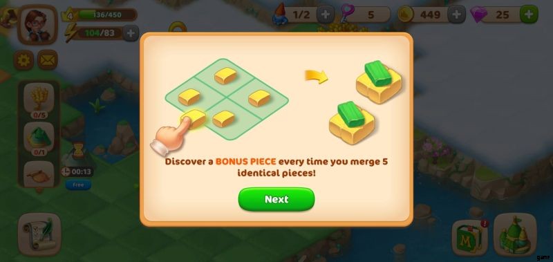 したがって、ゲームの初期段階では、すべての種類のピースを組み合わせて、何ができるかを確認してください。新しい要素を発見し続けることで、便利なコインを集めることもできます。新しいピースを作成するたびに、ゲームは小さなコイン報酬のロックを解除しますので、Merge book を頻繁にチェックしてそれらを獲得してください.