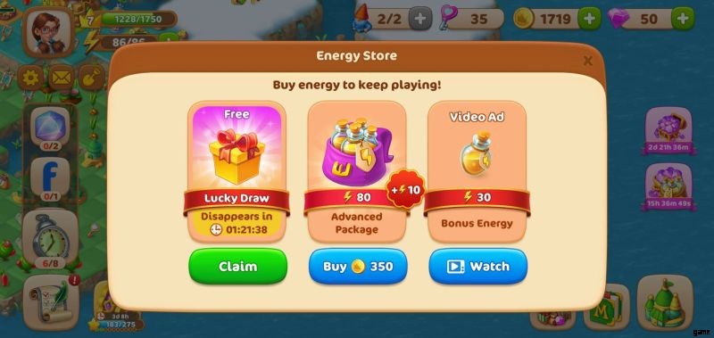 3.5 時間ごとに、無料のエネルギー ボーナスを獲得できます。さらに、30 エネルギー ポイントと引き換えに広告を見ることができます。オファーは数時間後に更新されるため、ショップに戻って追加アイテムを確認してください。特定のクエストの完了が近づいているために追加のエネルギーが本当に必要な場合は、80 エネルギー ポイント (+10) と引き換えに 350 コインを支払うことを検討してください。ここで、コインを持っていると本当に役に立ちます。