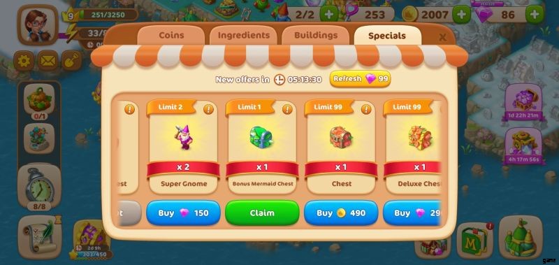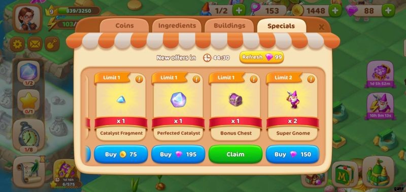 Check out the Specials :these offers vary the most, so make sure you keep an eye out on what’s new in this section. Here you can find objects like the Chest of Tales which you can have for 80 Gems. If you’re looking to make more Catalysts, then you can purchase Catalysts Fragments from this section in exchange for 75 coins. Super Gnomes are also available here, if you have even more Gems to spare.