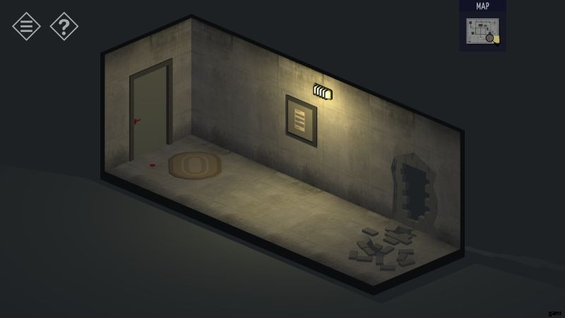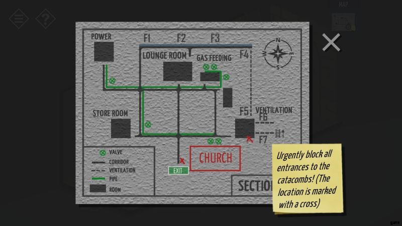 教会の下の部屋から拾った地図は、この章で非常に重要になるので、時々参照してください.この章は、端にロックされたドアがあり、ドアを閉めておくためのなぞなぞの使用について言及しているピン留めされたメッセージがある廊下で始まります。ドアマットを動かしてドアの鍵を見つけ、メンテナンストンネルに入ります。あなたの主な目標は、赤い「X」でマークされた部屋に入ることですが、そこに通じる唯一のドアは固く閉ざされています.