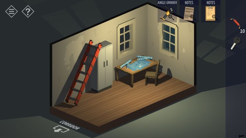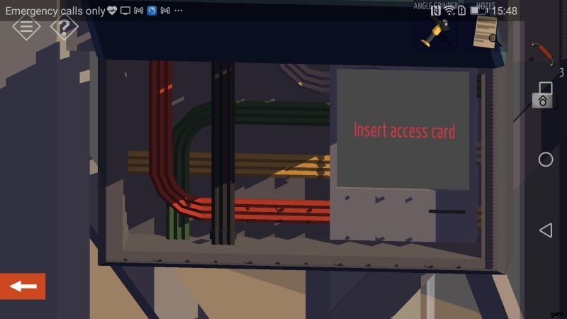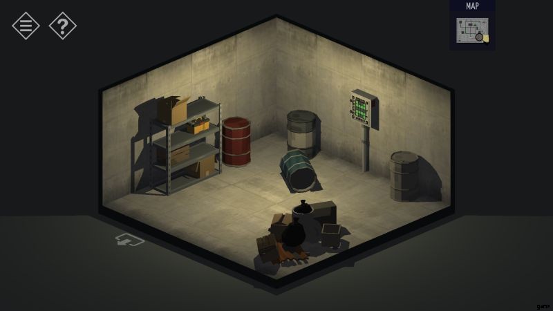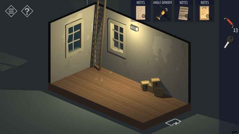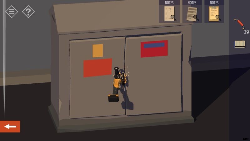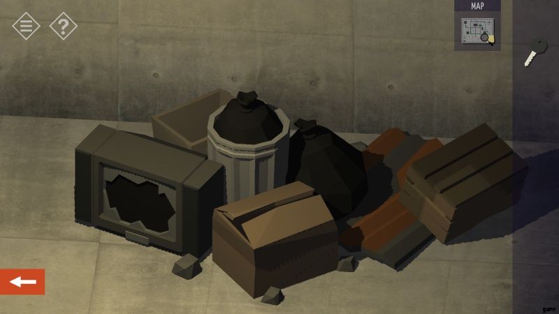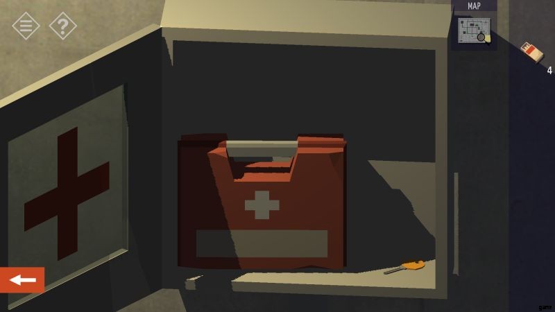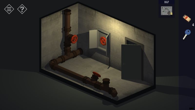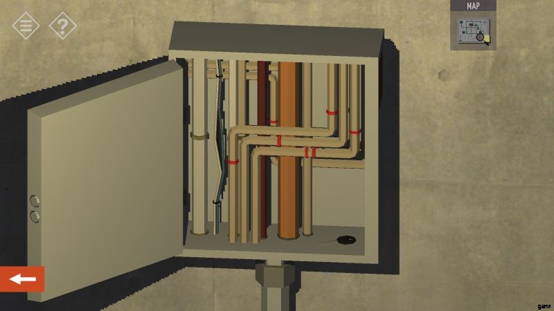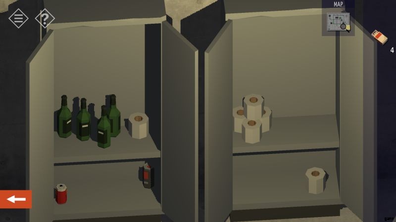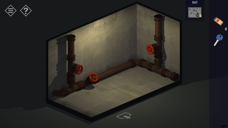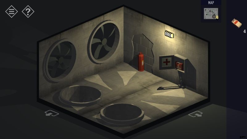 施錠された部屋には、別の露出した壁、応急処置キャビネット、およびドアが開かないようにする板があります。ボードを取り外してドアを開き、応急処置キャビネットを開いて黄色い鍵を見つけます。その黄色い鍵は、いくつかの空のガスボンベを含むガス供給室の近くの部屋を開きます。カメラを動かして、赤い色で区別される大きなタンクの後ろに満タンのプロパン ボンベを見つけます。