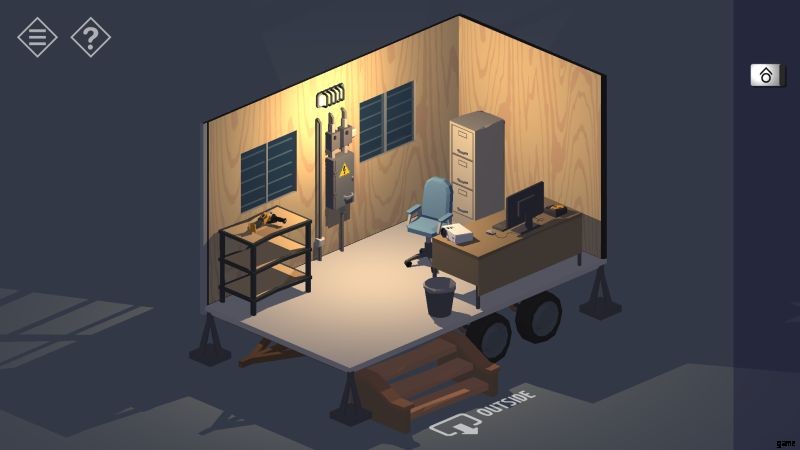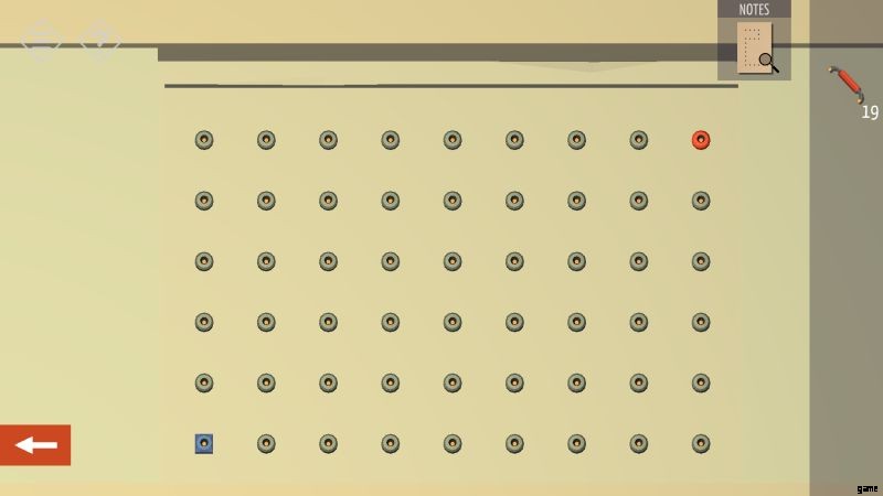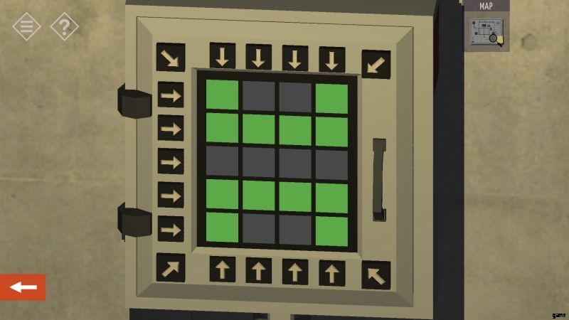 物置には部屋の端に大きなワイヤー ボックスがあり、グリッドを含むスイッチ パズルでロックされています。グリッドを囲むボタンを押すと、非アクティブなライトがオンになり、その逆も同様です。ここでの目的は、すべてのライトをオンにすることですが、グリッドは 4 × 5 の長方形であるため、対角線のボタンは対角に直接移動できないことに注意してください。すべてのライトがオンになると、ワイヤー ボックスが開き、黒い鍵が現れます。