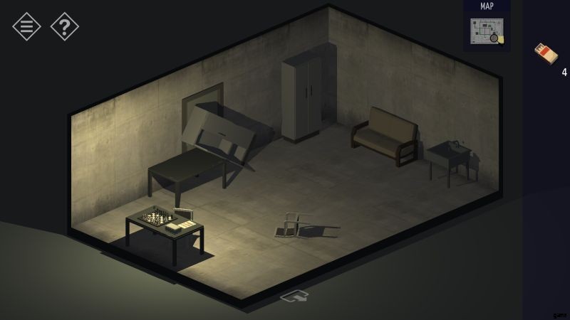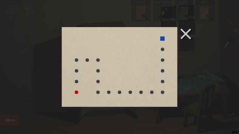 ラウンジルームには粗末なバリケードがあり、メンテナンスエリアからラウンジルームに入ることができません。バリケードを元に戻して、一周する必要がないようにします。 1 つの机には、ゲームの途中で放棄されたチェス セットと、ロックされたボックスがあります。別の机には、お絵かきパズルと鉛筆があります。最初に絵のパズルをします。