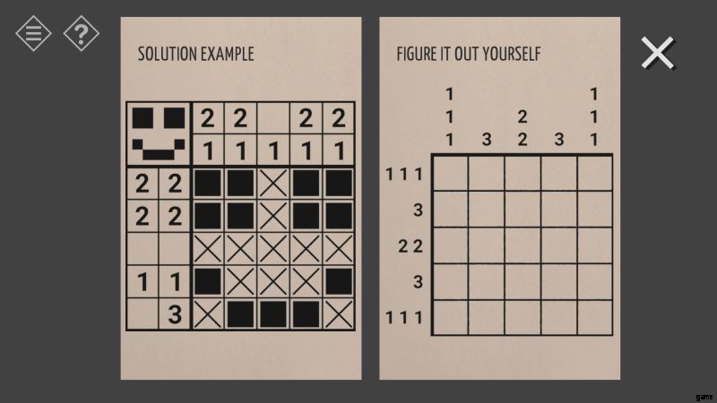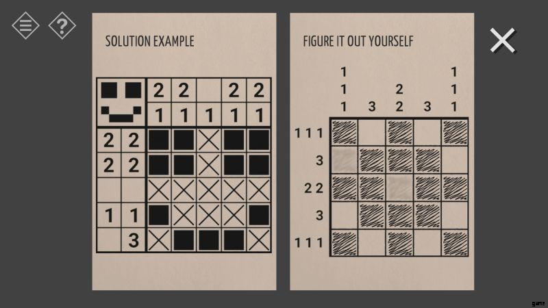 絵のパズルは、解決された例と、解決しなければならない空白の例を提供します。各グリッドの端にある数字は、空白のパズルで画像を表示するために影を付ける必要がある正方形を示しています。自分たちだけでパズルを解くのはかなり大変でしたし、数字の仕組みを解読するのも同様に困難でした。そのため、以下のパズルの解決策を提供しています。