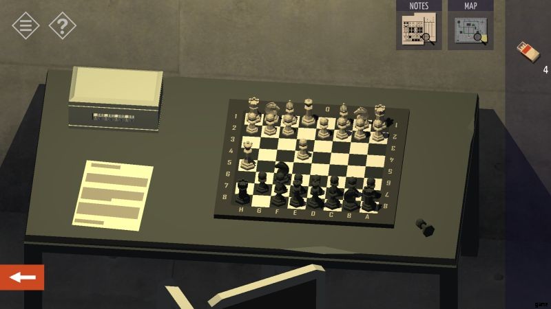 チェスのテーブルに行くと、文字と数字が交互に配置されたコードを使用するボックス、チェスのルールの簡単な概要が記載された紙、および移動されたいくつかのチェスの駒があります。チェス盤自体には、文字と数字でマークされたグリッドがあります。これらは、箱に記載されている文字と数字と一致します。