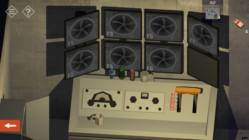 パワー ルームには、パスワードで保護されたコンソールと、ラウンジ ルームの青いキーでロックが解除される大きなスイッチ ボックスがあります。スイッチ ボックスには 3 つのスイッチがあり、1 つのスイッチにはハンドルがありません。ファン 2 の背後にあります。ファン 2 をオフにするには、コンソールのロックを解除する必要があります。コンソールには 4 桁のパスワードと、上部に 4 つの項目が並んでいます。アイテムには、(1) 青い炭酸飲料の缶、(2) ワインのボトル、(3) 黒い炭酸飲料の缶、(4) トイレット ペーパーのロールが含まれます。