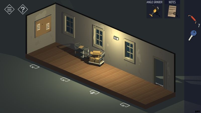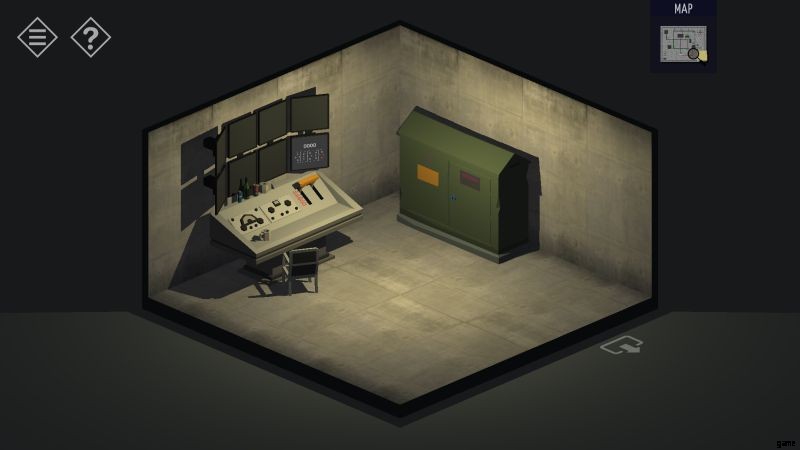 建物の中には、異なる色の鍵を使用してロックを解除する 4 つのドアがあります。ホールの反対側にある掲示板には、鍵がぶら下がっていて、トラックから何かを降ろすことについてのメモがあります。入り口から 2 番目のドアのロックが解除され、山への冒険を妨げている 4 つの非アクティブなシステムについて警告するコントロール パネルが表示されます。
