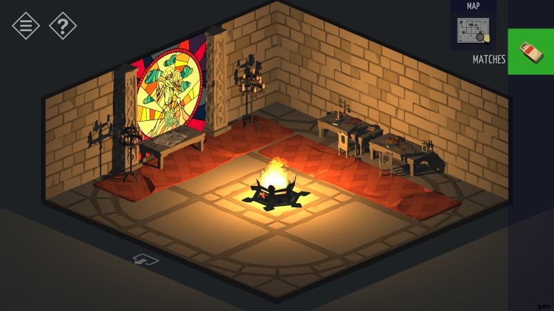以前と同じように、この新しい部屋は暗いですが、部屋の中央にある火鉢を照らすためのマッチがまだもう 1 つ残っている可能性があります。これにより、近くの山を描いたステンドグラスの窓と、未知のコンポーネントでいっぱいのテーブルが明らかになります。
