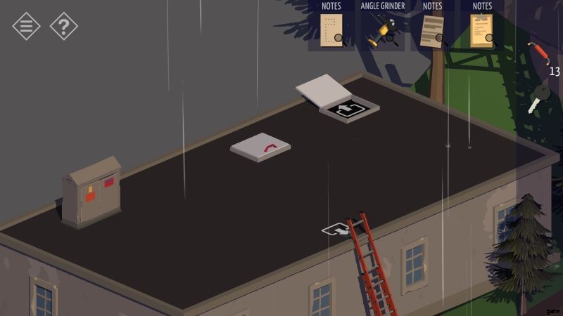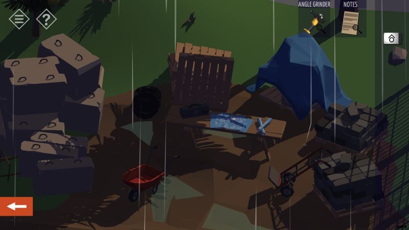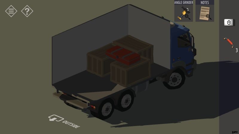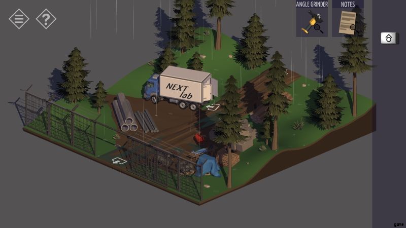 メモから推測できるように、掲示板から拾ったキーは、トラック内のケースのロックを解除します。これには、アングルグラインダーに適合するバッテリーが含まれています。バッテリーを1つ手に取り、入り口の小屋に戻り、机の上にある充電器を使用してバッテリーの電源を入れます.バッテリーが充電されたら、それをアングル グラインダーに取り付け、それを使用して屋根のエンクロージャー ドアを切り開くと、別のワイヤー パズルが現れます。