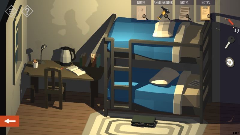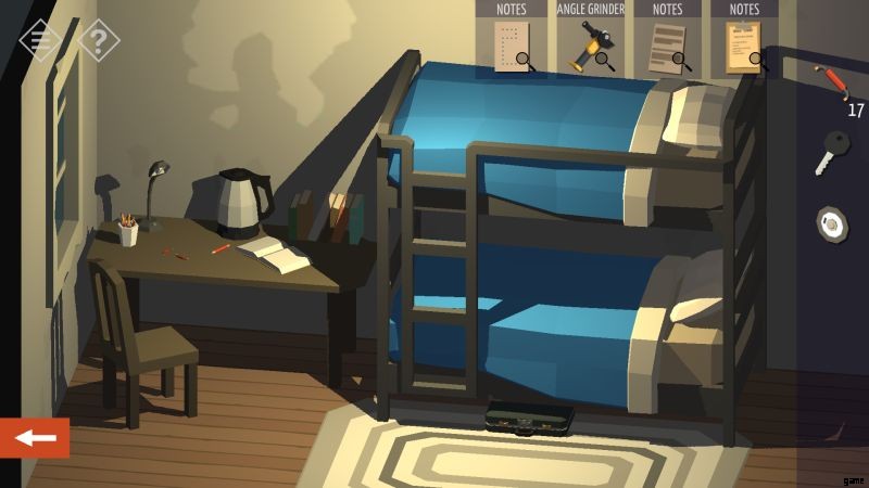 建物の中に戻ると、緑色の鍵を使用して、机と 2 段ベッドを含む最後の部屋のロックを解除できます。デスクには最後の 2 つのジャンパーがあり、二段ベッドの下には 4 桁のパスワードが入った鍵のかかったスーツケースがあります。枕を探して、4 つの長方形が描かれた紙を探します。これらの長方形は、建物自体のドアを表しています。