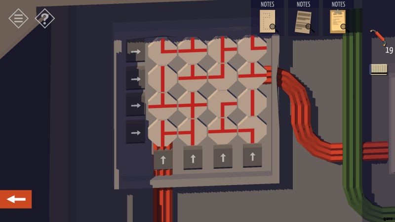修正する最後のシステムは回路接続なので、「修正」ボタンをタップして回路基板を明らかにします。最初の部屋で見つけた回路図に従って、19 個すべてのジャンパーを提供されたパターンに配置します。残念ながら、ゲーム内で回路図を回転させてより良い角度にすることはできません。